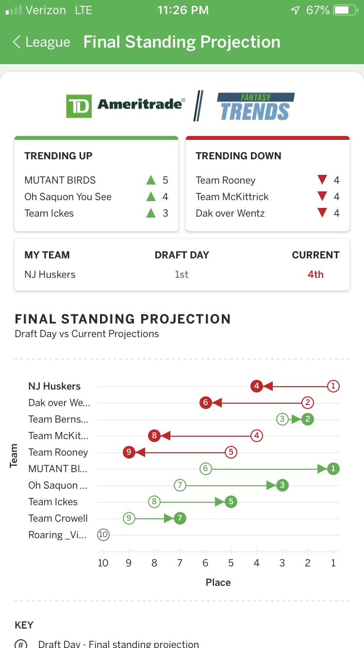 I tend to side with data, especially when it has your commissioner as the #1 team in the league after draft day. I know a few of you were wondering about the "trends," I'm thinking that is simply who is trending up/down on a weekly basis. I am 100% sure the "projections" of who is trending up/down will change by week one. So keep an eye on that!